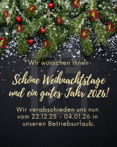 Unser Team genießt nun vom 22.12. – 04.01. den Betriebsurlaub, ab dem 05.01.26 sind wir wieder für Sie da.